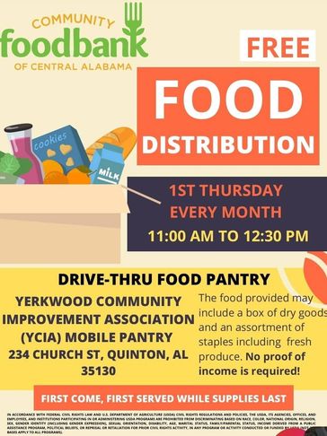 Walker County's very first drive-thru food pantry takes place every first Thursday of every month starting at 11am at 234 Church Street, Quinton AL 35062.